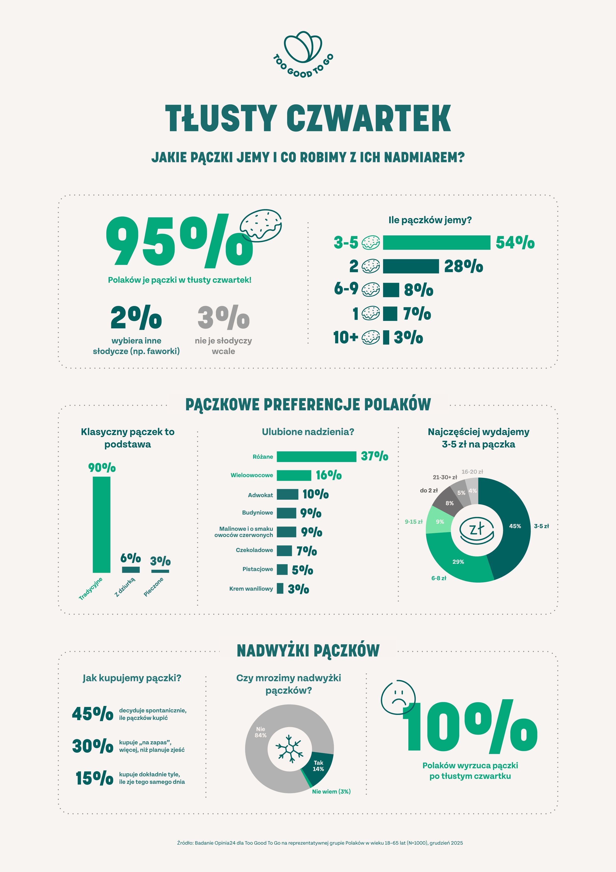 Tłusty czwartek od kilku lat rozpala emocje nie tylko w kontekście cen, ale również w skali nadwyżek, które wynikają z trudności w oszacowaniu wolumenu produkcji. Najnowsze badanie Opinia24 na zlecenie Too Good To Go pokazuje, że tradycja ta angażuje zdecydowaną większość społeczeństwa. Tylko 5% Polaków nie zjada pączków w tłusty czwartek - 2% preferuje inne słodkości, np. faworki, a tylko 3% nie jada słodyczy wcale.
